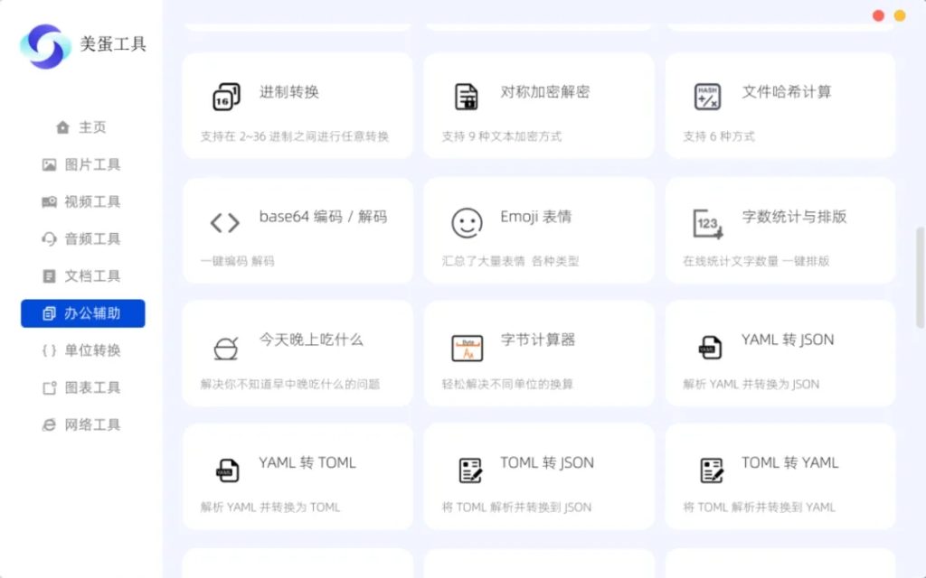 另外,工具箱中还包括了一些办公辅助工具,其中有些功能相当实用,比如文件哈希值计算、数值进制转换以及emoji表情生成等。